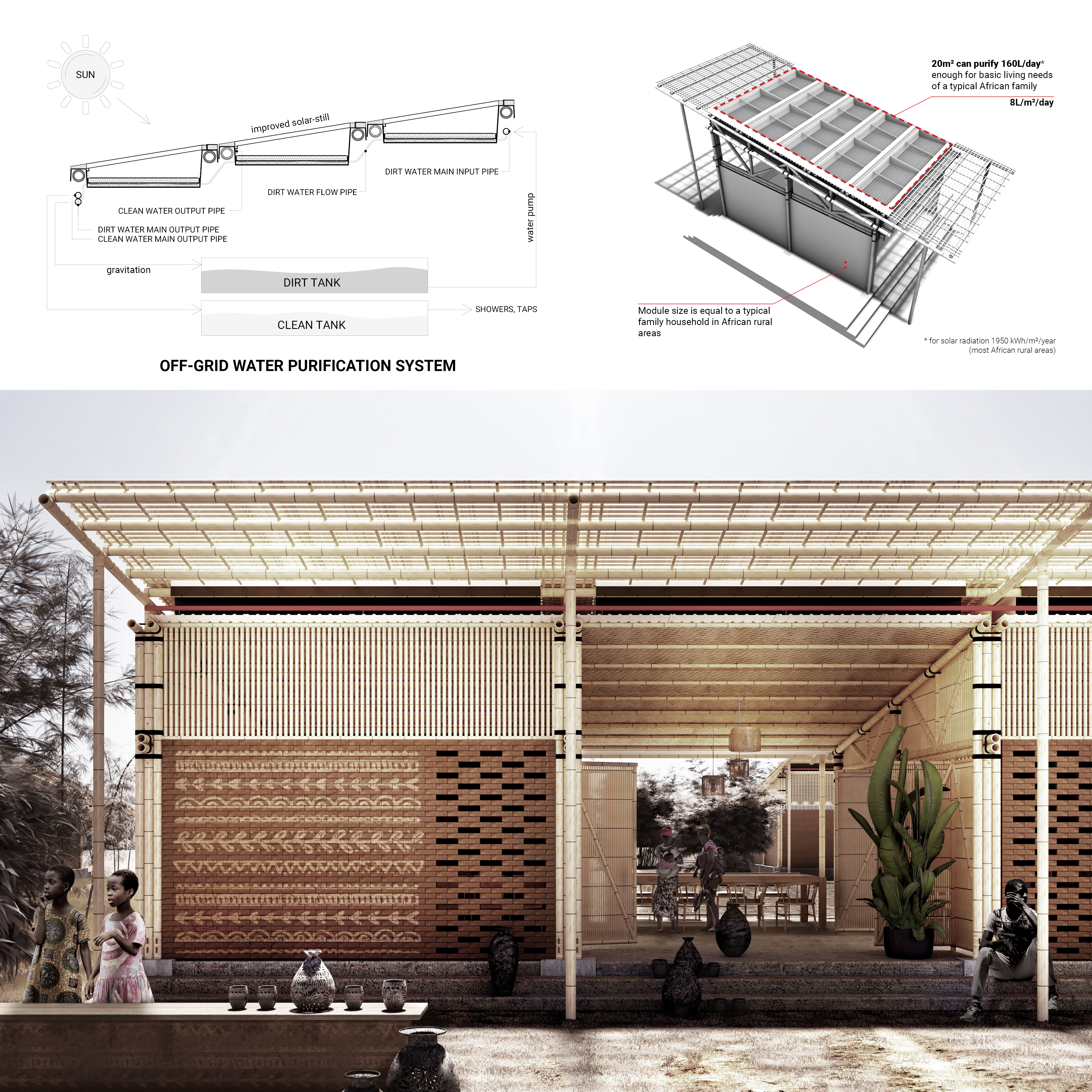 First prize: “Redesign disaster” by Filip Zielinski (Poland, Delft University of Technology). Housing module for African communities with difficulties in accessing water, which integrates a roof with a system for purifying condensed water and rainwater using energy produced by solar panels.