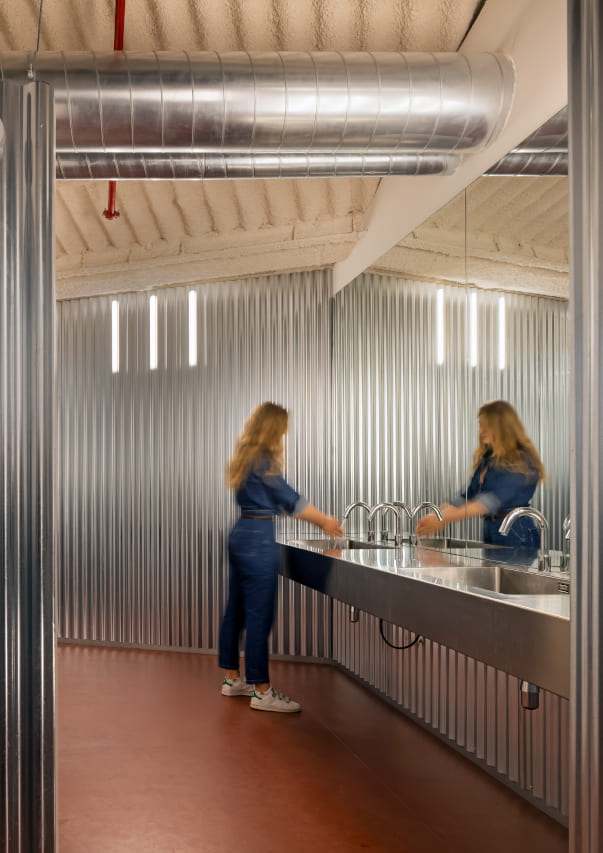 At the heart of the transformation is the bathroom, a space reimagined not just as a necessity, but as a sanctuary for employees. Here, undulating steel walls echo the building's façade, creating a sense of continuity while adding a futuristic touch. The minimalist design is both striking and functional, with red flooring contrasting against metallic surfaces to create a space that feels both intimate and expansive.