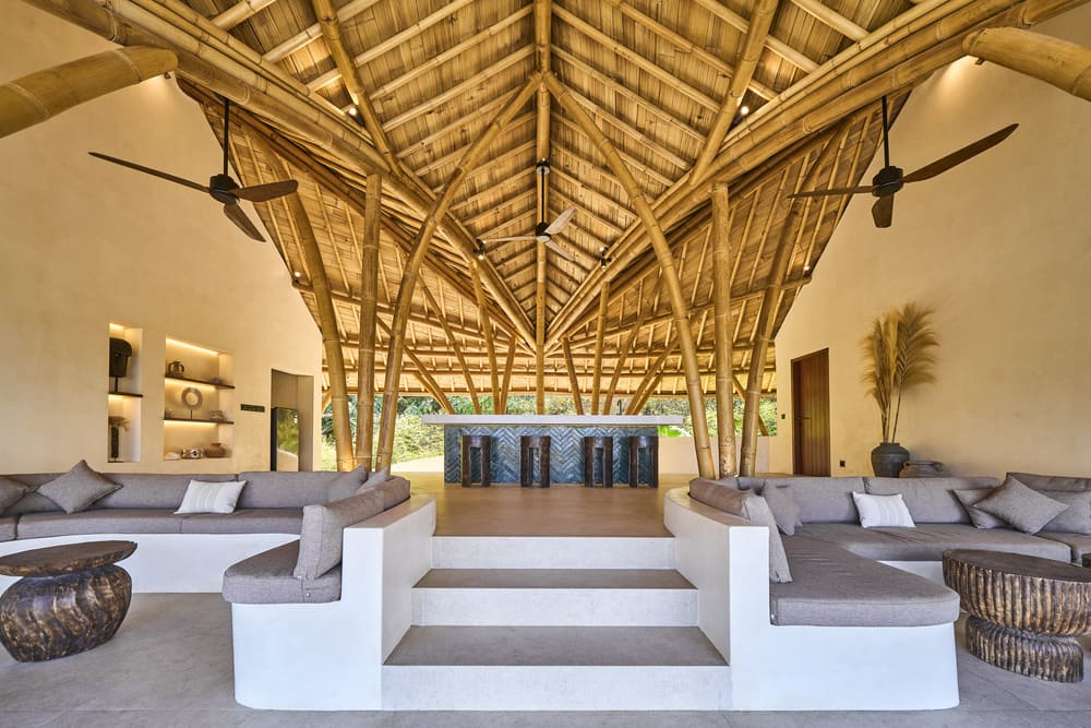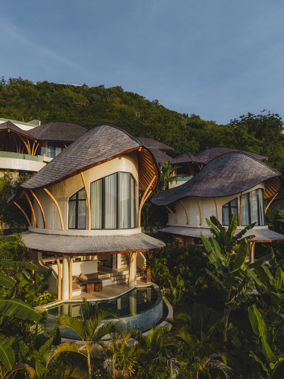 Mambo’s villas are designed to maximise views and the guest’s connection with the island’s lush landscape. Materials such as bamboo, stone, and carved Indonesian wood are enhanced by soft, neutral finishes and organic forms. References to water are always present, whether the wave-like bamboo ceiling, the rounded exterior pool or the individual bathrooms that naturally extend between the rooms and the private exterior spaces.