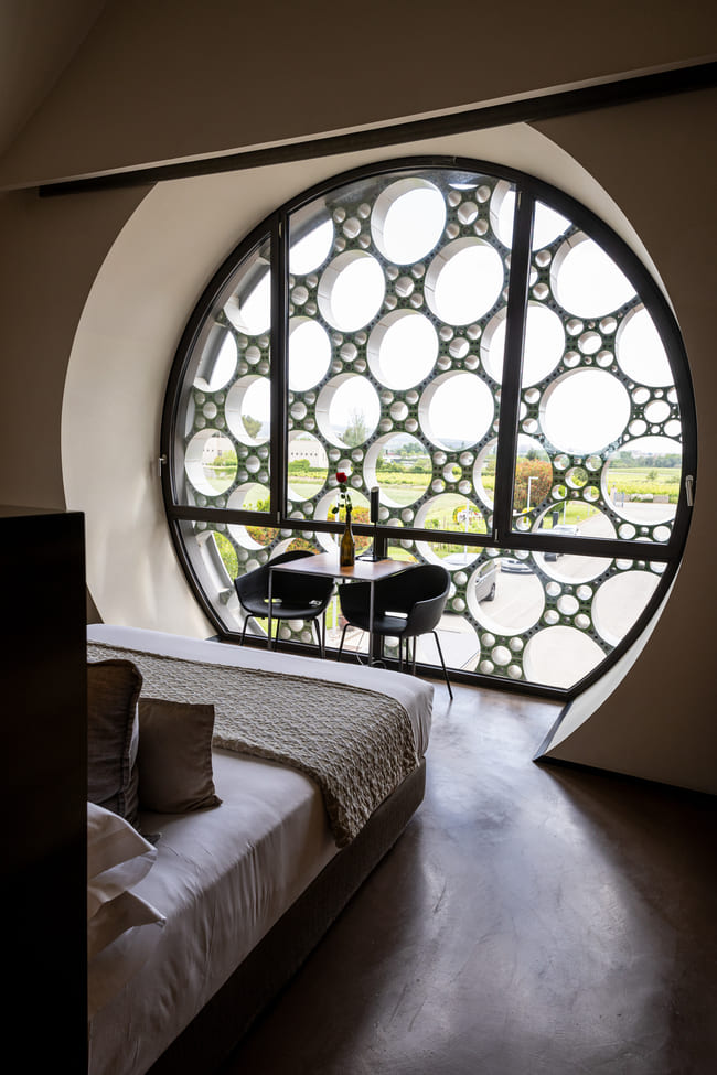 Inside, the hotel continues to draw inspiration from its natural surroundings. In the bedrooms, the sinuous lines of the building give way to smooth, curved ceilings that enhance the sense of space. Large, circular windows with geometric patterns allow natural light to flood the rooms, offering breathtaking views of the vineyards. The use of wood, glass and black accents creates a cohesive and stylish look that balances contemporary design with natural elements.