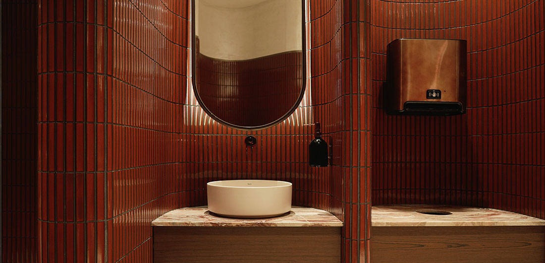 The choice of bathroom elements was an important part of maintaining the authenticity of the design. Washbasins, toilets and accessories were chosen to complement the restaurant’s modern take on traditional elements. Over-countertop basins with smooth, rounded shapes echo the organic curves found throughout the space, while wall-hung, rimless toilets offer clean, sleek lines that blend effortlessly into the aesthetic without detracting from the overall design.