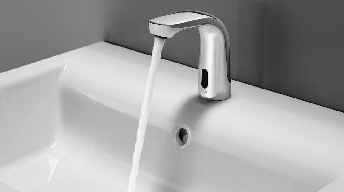 Avoid hand contact in the bathroom with a faucet with presence sensor that does not require any electricity.
